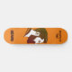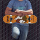 Imagem de um perfil macho barbudo em verde e vermelho sobre fundo laranja. Em letras vermelhas escuras, o texto "RESPEITAR A BARRA". Um skate projetado para barbeiros e amantes da barba... Para designs mais bonitos, possam visitar nossos Criadores.