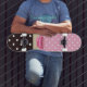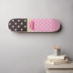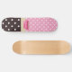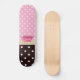 Um skate cor-de-rosa e marrom feminino do teste padrão de bolinhas com um teacup cor-de-rosa bonito aparou com uma beira na moda do coração, e uma fita cor-de-rosa bonito amarrada em um arco no punho. Personalize adicionando seu nome. Aperfeiçoe o presente para a menina feminino que amaria trazer um tea party do divertimento onde que vai!