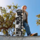 This skateboard features a black and white pop art style design of the San Diego skyline and San Diego Bay.
