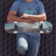 The image captures a low-angle view of two towering skyscrapers against a bright blue sky with fluffy white clouds. The building on the left is a reddish-brown color with large windows reflecting the sky and clouds. The building on the right is a sleek, modern glass structure with a curved facade.