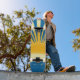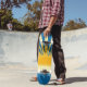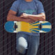 Esse skate amarelo azul-azul Boho Retro 70s, brilhando, ficará igualmente legal na rua ou na parede