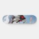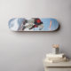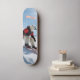 Design divertida e atraente de um boneco polar a snowboard numa jaqueta vermelha brilhante de esqui, contra picos de montanha de neve. Um branco e desportivo parece perfeito para um skate personalizado que se destaca nas encostas ou nas ruas.