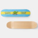 Cartoon de tartaruga de patinação em turquesa e skate amarelo.