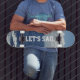 A vela de vamos é escrita em texto branco. Céu azul, nuvens brancas fluffy. Oceano com ondas de espuma branca. Fotografia original e Design por TamiraZDesign.