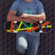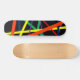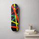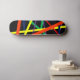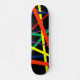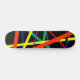 Este andar de skate está coberto por linhas multicoloridas - vermelho, laranja, amarelo, verde, azul, roxo - sobre um fundo preto que as faz pop.