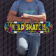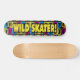 Este skate com padrão geométrico tem muita cor e texto WILD SKATER.