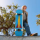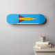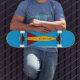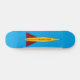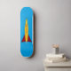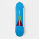 O skate Rocket AD8 apresenta a imagem de um foguete colorido, amarelo com barbatanas vermelhas, sobre um fundo azul para o skate voador alto corajoso o suficiente para montá-lo.