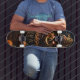 La patineta tiene un diseño peculiar y llamativo, representando un horroroso fantasma calabaza. Esta patineta presenta una ilustración que combina elementos de un fantasma y una calabaza de una manera que sugiere un aspecto espeluznante o aterrador. La combinación de la palabra "horroroso" indica que el diseño tiene la intención de transmitir una sensación de miedo o susto, lo cual puede resultar intrigante y atractivo para aquellos que buscan algo único y distintivo en su equipo de patinaje. En resumen, se trata de una patineta con un diseño temático que fusiona la figura de un fantasma con la forma de una calabaza, generando una estética visual impactante y quizás un tanto siniestra.