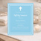 Um fundo azul-céu, decorado com um quadro branco, e uma cruz branca Personalize e adicione o nome e os detalhes. Texto branco. 1 folha = 1 convite impresso de borda a borda.