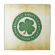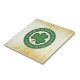 SlipperyJoe's Dia de São Patrício brilhante trevo verde de três folhas emblema circular negrito centrado fundo artístico texturizado como pergaminho pequenos ícones irlandeses brancos letras maiúsculas limpas efeito tridimensional ligeiramente elevado letras curvas em torno de forma esférica botão brilhante sombra sutil profundidade presentes celebrando LGBTQIA tons quentes bege e dourado olhar dimensional polido