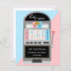 Um chá de fraldas orçamental único e peculiar ou gênero revela convite. Em um fundo azul e rosa, o design consiste em uma máquina de caça-níqueis. O sobrenome do bebê está escrito dentro do texto da tipografia branca, e fraldas azuis e rosa são usadas para revelar um bebê ou uma menina como o jackpot. Personalize adicionando seu evento de cheio e os detalhes de contato à frente e atrás.