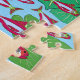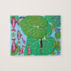 Quebra-cabeça de serra com uma folha Snake@Green única. Uma grande folha verde esconde-se atrás dela um cobra com manchas pretas e uma língua vermelha. Sapos em tons verdes diferentes com folhas verdes pequenas. Peixes vermelhos e camundongos.A cor do impressão inclui tons de verde, cinza, vermelho, um toque de azul que complementa perfeitamente a cor principal do quebra-cabeça de serra.