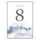 Cartões de números de tabela chic em tons suaves de azul, cinza e branco apresentam um fundo de cor d'água representando uma cena de montanha de neve pontilhada com pinheiros. Personalize com cada número da tabela, com seus nomes e data de casamento embaixo. Design repete-se no lado oposto. Coordena-se com a nossa suíte de convite para casamento.