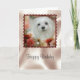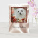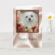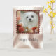 Este Cartão de Aniversário apresenta um retrato de Snowdrop, um doce pequeno Cachorro Maltês com algumas belas flores de focagem mole e um quadro com rico escalado.