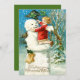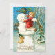 Este boneco de neve e seus amigos estão se divertindo muito. Este impressão de natal vintage retrata um boneco de neve brincando com um cherub. Ele tem quatro folheados no chapéu.