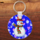 Bonito boneco de neve, estrelas e corações em fundo azul. Chaveiro adorável, tão bom como o presente de Natal!