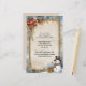 Um velho boneco de neve num cachecol e chapéu de cima está num banco de neve ao lado de um presente de Natal embrulhado neste charmoso convite de festas de Natal. Linda cena rústica, e perfeita para as suas reuniões de férias! Remova o texto e ele faria um artigo perfeito para as newsletters de feriado.