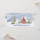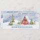 Este adorável cartão de saudação de inverno apresenta uma cabana vermelha, com quadro A, na neve de inverno, com texto que diz "desejos de inverno quente." As costas têm uma colina de neve com espaço para escrever na sua própria mensagem.