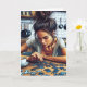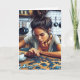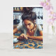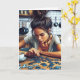 Um cartão bonito para enviar a um amigo ou membro da família. Só perguntando como você está, vamos pega o cartão de saudação. Ilustração de uma mulher fazendo um quebra-cabeça na mesa da cozinha.