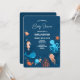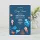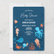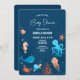 Sob o Convite para Chás de fraldas de animais do oceano marinho. Um mundo submarino bonito. Aquático. Oceano. Animais subaquáticos. Água-viva, caranguejo, cavalo marinho, peixe, tartaruga, polvo, coral, peixe-estrela, baleia. Coleção marinha com criaturas marinhas para raparigas e rapazes