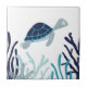 Tartaruga marinha nadando entre as algas e corais em tons de azul com fundo branco.