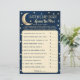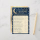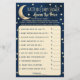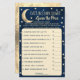 Este jogo "sobre a lua" é perfeito para qualquer um que tenha um chá de fraldas este ano. A design apresenta uma lua ouro com estrelas sobre um fundo de cor azul-água marinho e uma formulação de modelo fácil de personalizar. Simplesmente dê esses cartões de jogo aos seus convidados para jogar no chá, quem estiver mais próximo do custo total real, sem passar, ganha um prêmio de sua escolha!