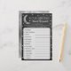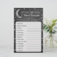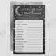 Este jogo "sobre a lua" é perfeito para qualquer um que tenha um chá de fraldas este ano. A design apresenta uma lua prateada com estrelas sobre um fundo de efeito de quadro de quadro de aviso e uma formulação de modelo fácil de personalizar. Basta dar esses lençóis aos seus convidados para jogar no chá, quem desembaralhar as palavras primeiro, ganha um prêmio da sua escolha! Respostas: 1) Fralda 2) Chá de fraldas 3) Esfregaço 4) Enfermeiro 5) Cobertura 6) Pacificador 7) Ponto único 8) Transbordo 9) Atividade Mat 10) Mistura 11) Bassinet 12) Frasco 13) Bovinos