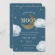 Este belo convite para o chá de fraldas "Sobre a Lua" apresenta fundo azul-da-meia-noite / marinho azul com uma lua de crescente brilho dourada, estrelas e nuvens lisas no céu noturno. Altere a cor de fundo e personalize para suas necessidades. Você pode encontrar mais produtos correspondentes na minha loja.