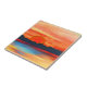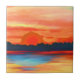 Azulejo cerâmico num pôr do sol semiabstrato atrás de um litoral com árvores, em cores psicodélicas de Fiery orange e vermelho, acentuadas com o azul-oceano