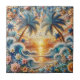 Representação de um pôr do sol do oceano com palmeiras e flores feita em um efeito de coloração 3D.