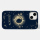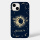Sol dourado celestial e lua, e estrelas em fundo azul-marinho.