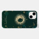 Sol e lua de ouro celestial, e estrelas sobre fundo verde.