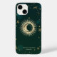 Sol e lua de ouro celestial, e estrelas sobre fundo verde.