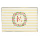 Esta é uma bonito esteira floral com espaço para a sua letra de monograma personalizada. Tem uma coroa de flores com aquarela, aspecto pintado e listras em branco e amarelo ensolarado claro. O design repete atrás. Dica: Se você quiser ajustar a cor, a parte amarela clara do fundo listrado pode ser "Personalizada" para qualquer sombra que você quiser! Você também pode alterar a cor da fonte ou da fonte em cada lado.