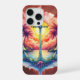 Solar anchor in a tropical paradise. Vibrant design with prominent anchor and cross, surrounded by palm trees, radiant sun and island scenery; neon palette and intense sunset for a bold and tropical look.