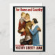 Ilustração antiga de patriotismo com uma família feliz, o pai segurando seu filho sorridente enquanto abraça sua esposa. Um capacete está pendurado ao redor do pescoço do soldado e sua esposa admira uma medalha presa ao uniforme dele. Para casa e país, Empréstimo da Liberdade da Vitória por Alfred Everitt Orr, 1919.