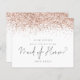 Solicitação de Madrinha de casamento de Script de Glitter Dourado do Rosa de Orçamento. Um alternativo de 4,5" x 5,6". Disponível em um STOCK CARD CARD STOCK SEMI GLOSS de 110 lb, que é a opção padrão (mais espesso para convites) que está em um script de conjunto de na moda está no centro. Uma borda de falso brilho em ouro de rosa está no topo de cada lado.