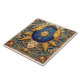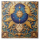 Um azulejo com uma mulher dormindo enquanto um sonho aparece sobre ela com um sol com rosto flanqueado por seres celestes flutuando em um céu estrelado à noite cercado por ornamentos de ouro.