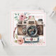 Este cartão de aniversário divertido apresenta uma câmera vintage caprichosa com um lugar para você inserir uma foto no centro da lente. A parte de trás do cartão apresenta outra câmera com cupcakes e uma saudação que diz "desejando uma foto perfeita de aniversário".