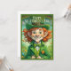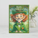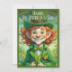 🍀 Uma jovem alegre vestida de feixes de duende com entusiasmo, segurando um belo presente de ouro embrulhado. Ela veste uma roupa verde vibrante, completa com um chapéu de cima adornado com xamrochas, uma gravata arco e botões de ouro. O fundo captura uma cena festiva da cidade com confete no ar, melhorando o espírito alegre das Ruas. Dia de Patrick. A imagem irradia sorte, felicidade e celebração. ✨