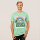 Esta camiseta verde apresenta um arco-íris com a escrita Lucky e o texto Suficiente para ser irlandês com uma shamrock verde no lado esquerdo. Há linhas brancas curvas entre as cores bonito do arco-íris. A camiseta é uma camiseta Tri-Blend da Canvas Bella.