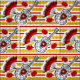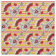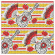 Design de Whimsical desenhado em estilo retrô, com lembranças de um feriado espanhol; uma guitarra de ferro em formas brutas, um fã de legado e uma rosa vermelha, em fundo listrado decorativo. Um design personalizável em preto, branco, vermelho e ouro amarelo para você personalizar com seu próprio texto, imagens e ideias. Uma imagem de arte digital original.