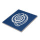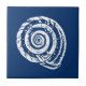 Azulejo cerâmico num bloco solteiro de uma concha espiral, em branco sobre fundo azul de cobalto
