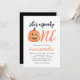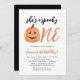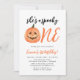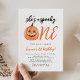 Convites de aniversário bonitos e temáticos do Dia das Bruxas com a frase "Ele/ela é mauzinha" em um roteiro manuscrito com uma jack-o-lanterna de aquarela. Personalize os convites de festas de primeiro aniversario assustadores com os detalhes de sua festa abaixo.