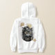 An intriguing looking pussy cat wearing a leather hat with steampunk brass on it. A golden feather tops the cock-eyed hat. This beautiful feline is wearing a golden or amber lensed monocle giving one eye a bronze tone, Around the cats neck hangs a brass trinket of some kind adding to the overall Steampunk attire. Brass cogs of the Victorian Technical era surround this intelligent looking feline.