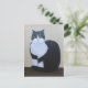 Estilo de Arte Folk, pintura acrílica de um bonito gato preto e branco sentado com a cauda envolta por cima dos pés. Ele estiva orelhas pequenas e olhos grandes. Pintada pela artista Rachel Barrette.