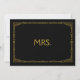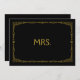 Simples e elegante sinal de casamento "Sra.", personalizado com o seu próprio texto, apresenta um quadro de deco de arte dourada sobre um fundo preto. Esta placa de casamento chic da "Sra." parece excelente impressa em um papel matte, se você precisar de algo mais tradicional use o Laid, Linen ou Columned, se você quiser adicionar um toque de vidro, use o Luxe. Clicando no botão "personalizar", você pode acessar a ferramenta do editor e escolher uma cor de fundo diferente. Este é um sinal de cartão impresso plano de 5" x 7", que ficará muito elegante em uma imagem.