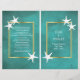 Starfish branco em papel branco manchado em folha de verduras modernas estilo livreto dobrado praias cerimônia de casamento e programa de festas com uma estrutura dourada sobre fundo azul-marinho escuro e estrelas-do-mar brancas nos cantos. Esta elegante design de casamento de verão faz parte de um casamento ou coleção e é um modelo perfeito para um casamento de verão de destino de praia. Você terá que dobrar no centro para ter um programa dobrado. Escolha apenas o tipo de papel de valor à medida que ele se dobra bem.