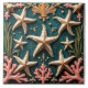 Vintage esculpida de azulejo com uma cena submarina de estrelas-do-mar flanqueadas por algas, corais cor-de-rosa e revestida de um ornamento floral ouro sobre um fundo verde-marinho escuro.