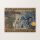 Quebra-cabeça de Halloween com uma bruxa estrelada voando através de um céu noturno estrelado sobre campos com abóboras, um gato preto, uma coruja, e uma lua que parece uma abóbora. Este é de um design de cartão de Halloween de 1913.